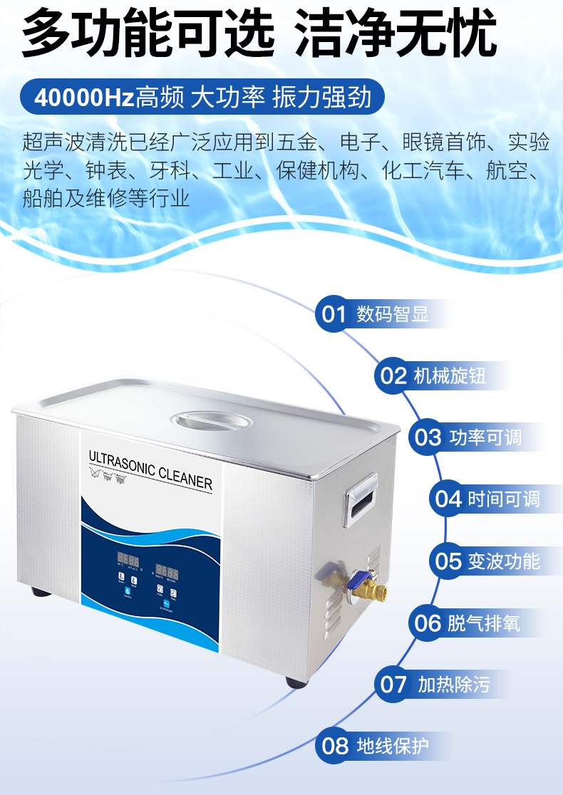 1.家用適用范圍:清潔高檔手表、品牌眼鏡、珠寶首飾等貴重物品和表鏈、水筆、光碟、刮須刀、梳子、牙刷、假牙、 茶具還有奶瓶、 奶嘴具等各類日用品,以及清洗水果、蔬菜、魚肉、碗碟筷等。