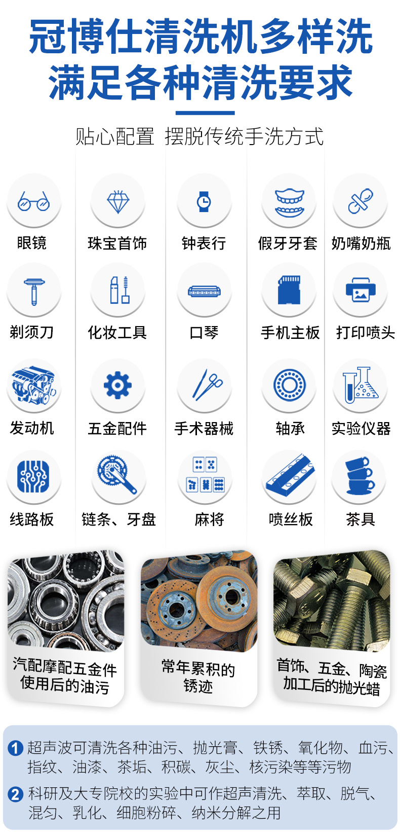 1.家用適用范圍:清潔高檔手表、品牌眼鏡、珠寶首飾等貴重物品和表鏈、水筆、光碟、刮須刀、梳子、牙刷、假牙、 茶具還有奶瓶、 奶嘴具等各類日用品,以及清洗水果、蔬菜、魚(yú)肉、碗碟筷等。