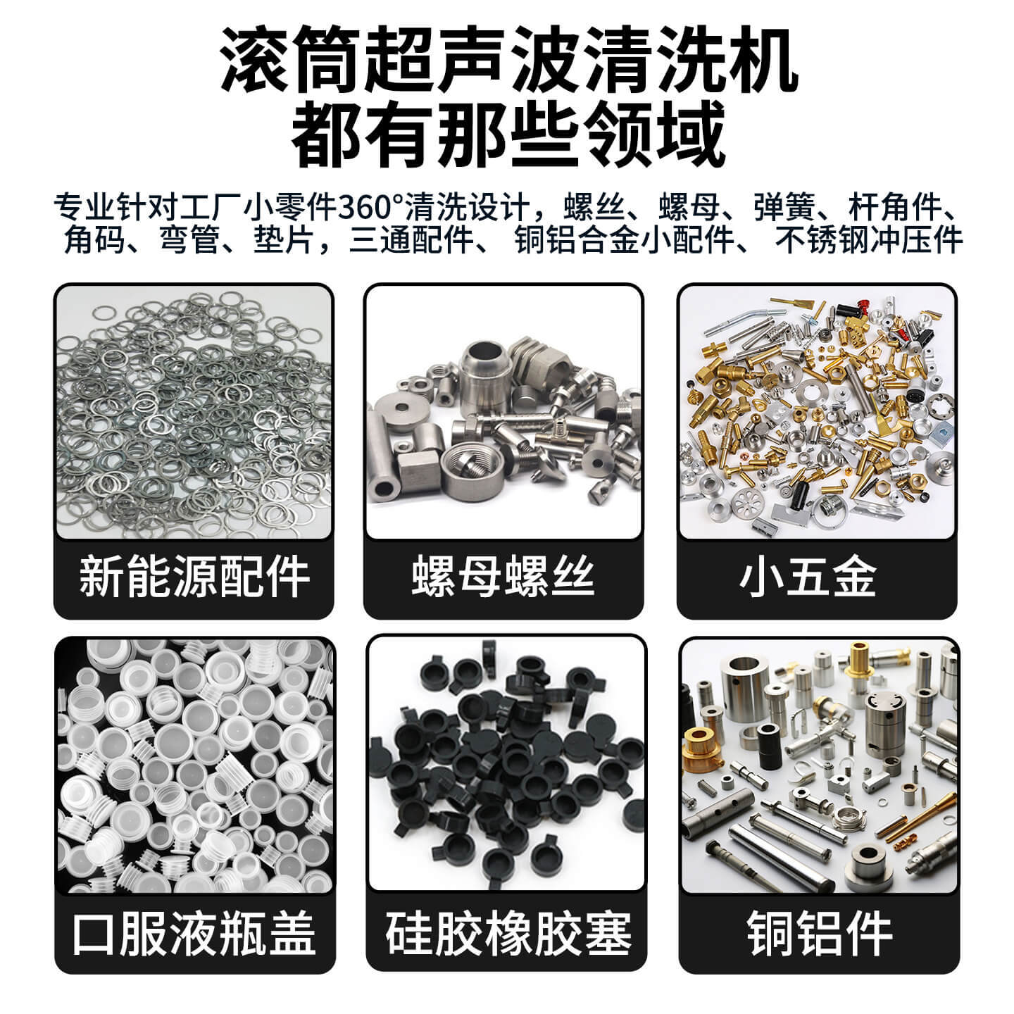 適用于工廠各類小型金屬零件的全方位清洗,包括螺絲、螺母、彈簧、桿件、角碼、彎管、墊片、三通配件、銅鋁合金小配件、不銹鋼沖壓件等精密部件。