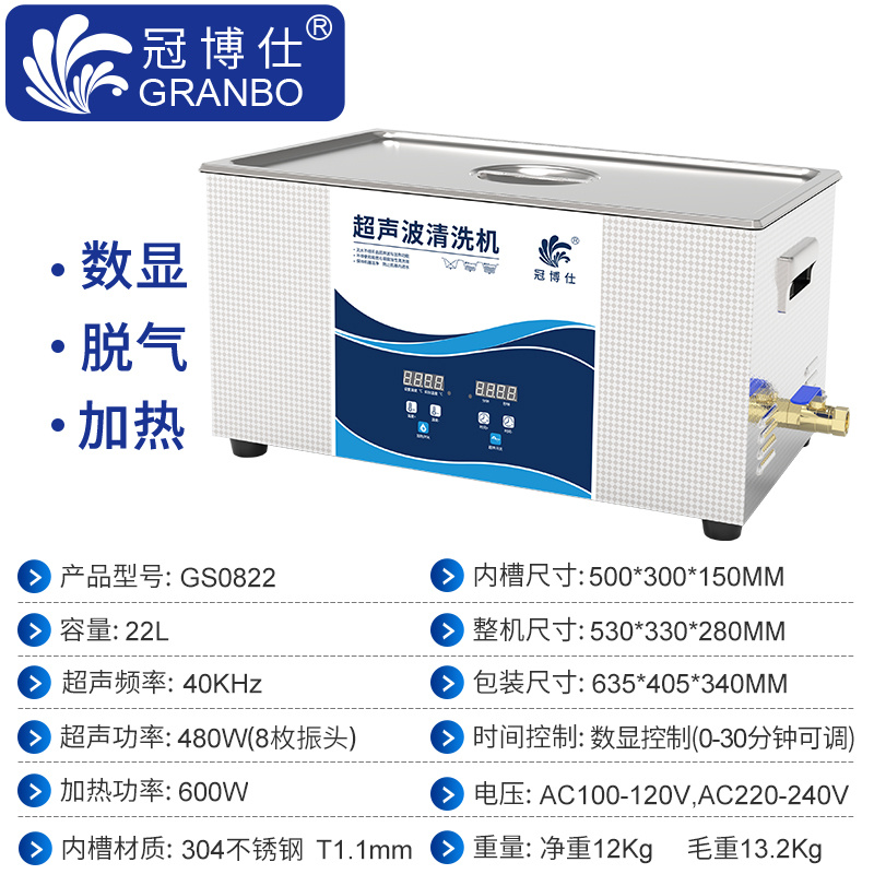 冠博仕GS0822超聲波清洗機|22L/480W|數顯定時調溫脫氣