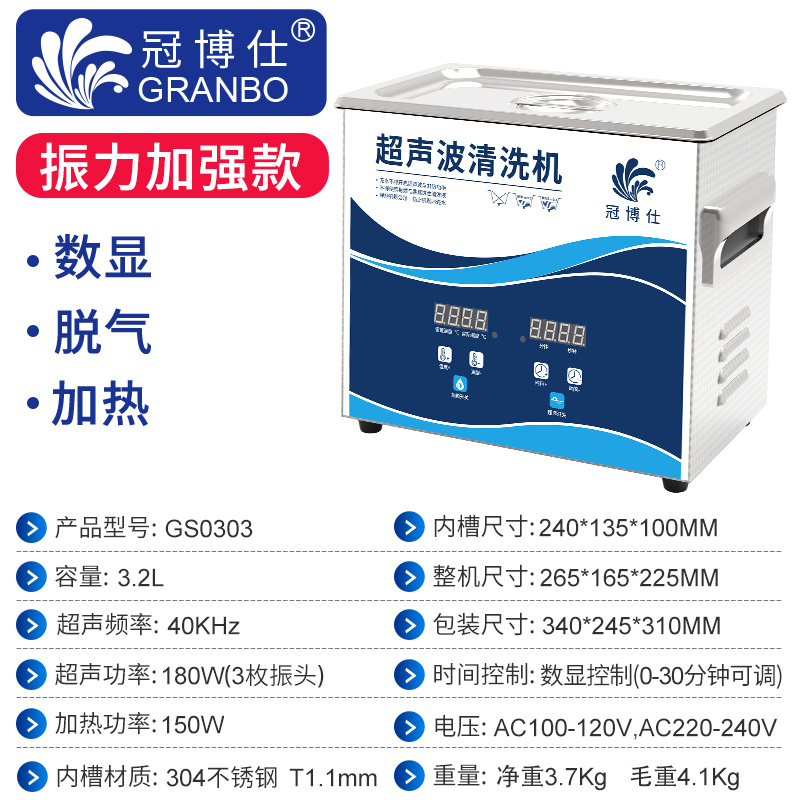 冠博仕GS0303超聲波清洗機|3.2L/180W|數(shù)顯定時調溫脫氣
