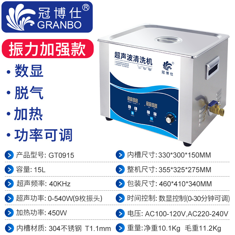 冠博仕GT0915超聲波清洗機(jī)|15L/540W|功率可調(diào)數(shù)碼定時(shí)帶加熱脫氣