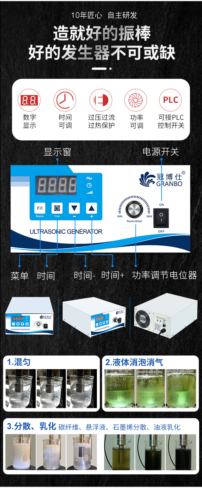 實驗室高校研究所應用:碳纖維分散擴散,化學溶液的攪拌、均勻、加速反應,細胞粉碎,產品粉碎,物質分散(懸浮液制備)和凝聚;