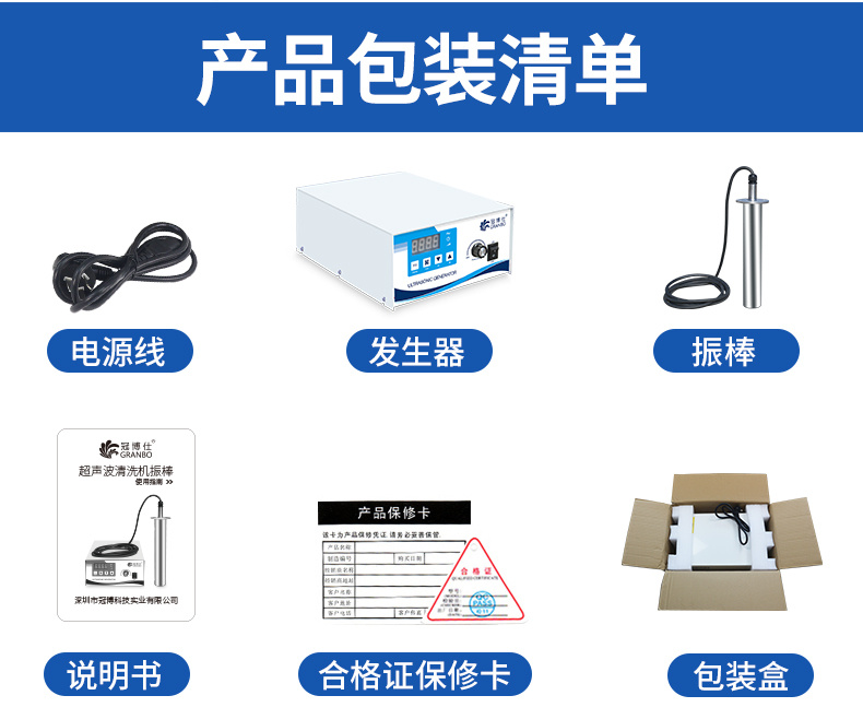 震棒、發生器、發生器電源、說明書、合格證保修卡、內置珍珠泡沫。
