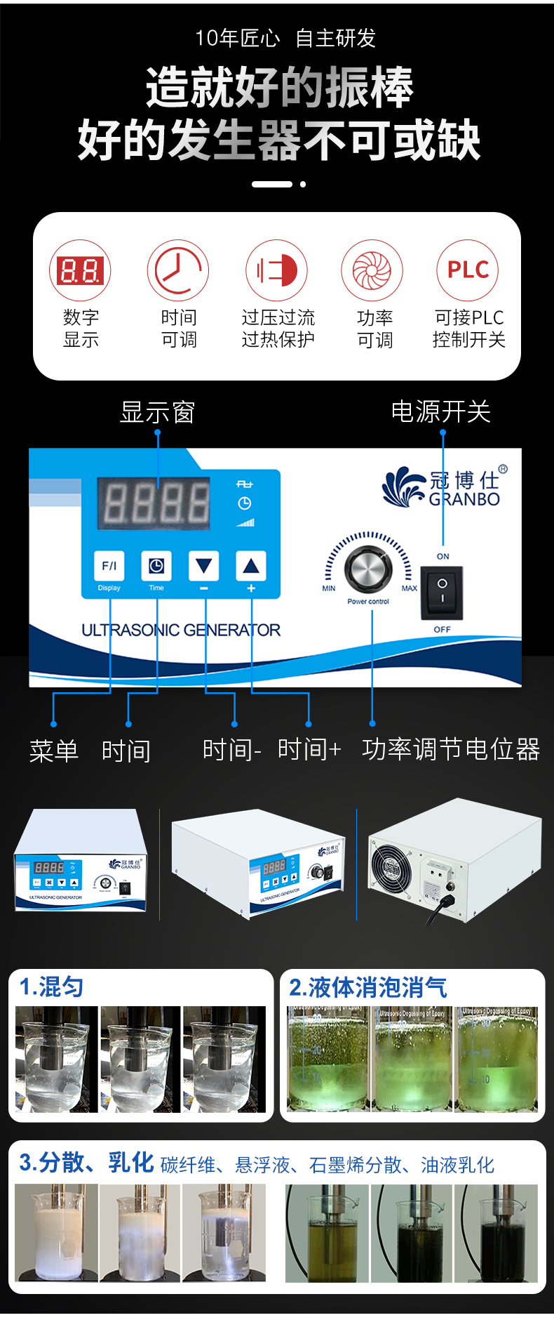 實驗室高校研究所應用:碳纖維分散擴散,化學溶液的攪拌、均勻、加速反應,細胞粉碎,產品粉碎,物質分散(懸浮液制備)和凝聚;